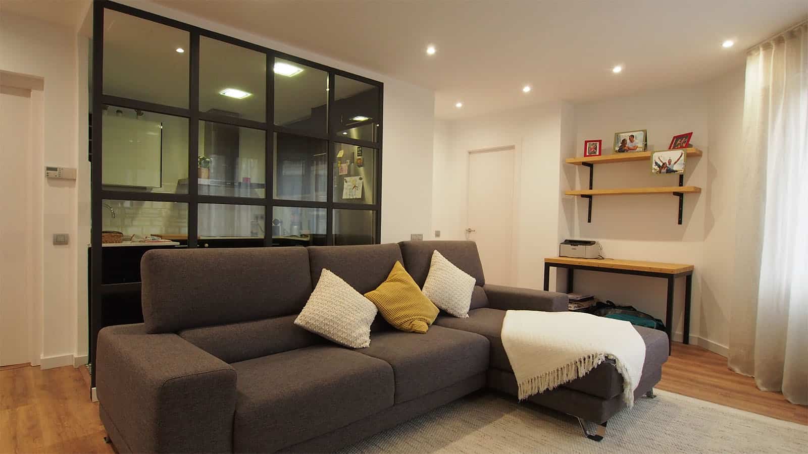 La cuina anterior era tancada i fosca. Dissenyant una paret de vidre amb quarterons negres a manera de separació, la cuina ha passat a ser una de les estrelles d’aquesta reforma. L’espai queda delimitat però es connecta alhora amb el menjador i la sala d’estar, fent que aquesta zona guanyi visualment en amplitud.